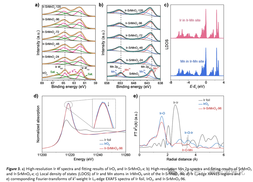 图3. a) IrO2和Ir-SrMnO3-x的高分辨率Ir 4f光谱和拟合结果;b) SrMnO3和Ir-SrMnO3-x的高分辨率Mn 2p谱和拟合结果; c) Ir-SrMnO3-96 的 IrMnO9 单元中 Ir 和 Mn 原子的局域态密度 (LDOS); d) Ir L3 边缘 XANES 区域和 e)
