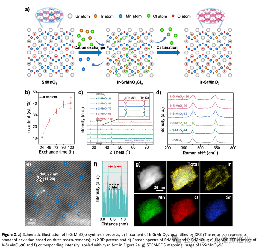 图2.a)Ir-SrMnO3-x合成过程示意图;b)通过XPS定量分析Ir-SrMnO3-x的Ir含量(误差条表示基于三次测量的标准偏差); c)SrMnO3和Ir-SrMnO3-x的XRD图案和d)拉曼光谱; e)Ir-SrMnO3-96的HAADF-STEM图像和f)在图2 e中用青色框标记的相应强度; g)Ir-SrMnO3-96的STEM-EDS图谱。