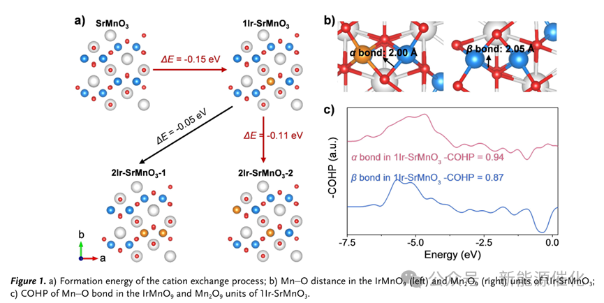 图 1.a) 阳离子交换过程的形成能;b)1Ir-SrMnO3 的 IrMnO9(左)和 Mn2O9(右)单元中Mn-O键的距离; c) 1Ir-SrMnO3 的 IrMnO9 和 Mn2O9 单元中 Mn-O 键的 COHP。