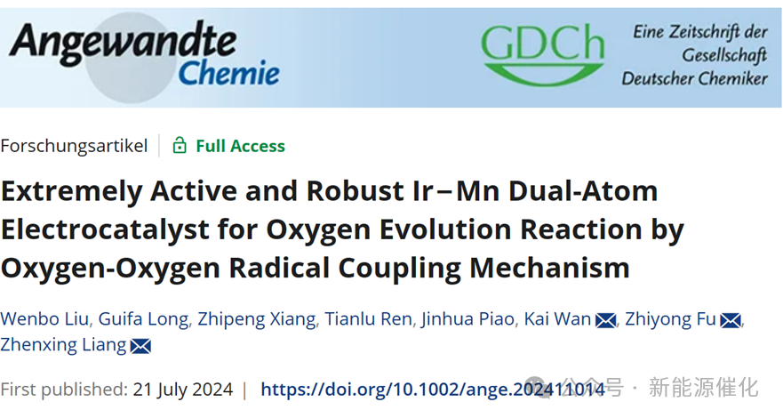 标题:Ir-Mn双原子电催化剂对氧-氧自由基偶联析氧反应的催化活性