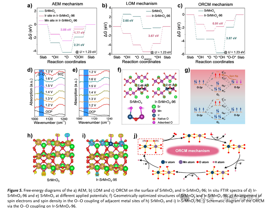 图5.SrMnO3和Ir-SrMnO3-96表面a) AEM、b) LOM、c) ORCM的自由能图;d) IrSrMnO3-96 和 e) SrMnO3 在不同施加电位下的原位 FTIR 光谱;f) SrMnO3和Ir-SrMnO3-96的几何优化结构;g)为 h) SrMnO3 和 i) Ir-SrMnO3-96 相邻金属位点 O-O 耦合中自旋电子的排列和自旋密度;j) 通过 Ir-SrMnO3-96 上的 O-O 耦合的 ORCM 示意图。